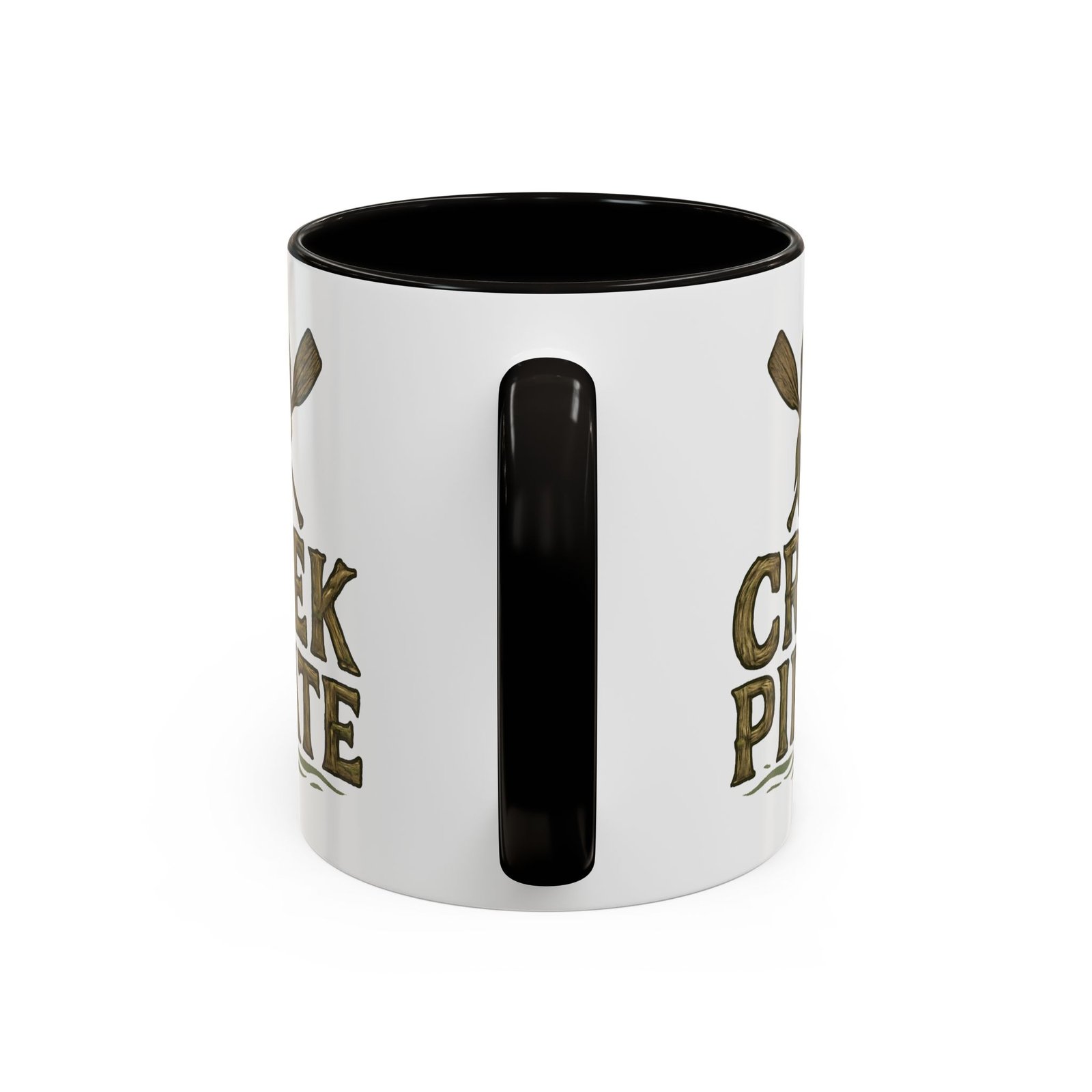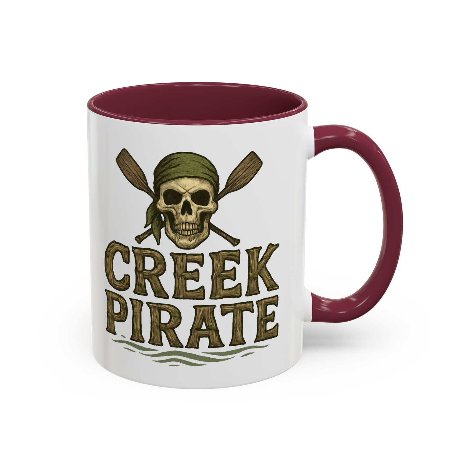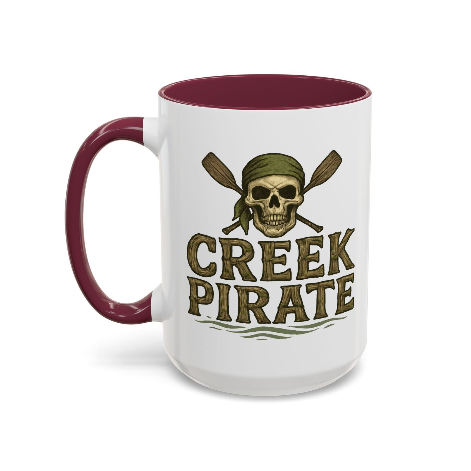 DESIGN: Our Creek Pirate logo on a white background. Just says “CREEK PIRATE” with our pirate skull wearing a bandana and crossed oars. Colors include browns, greens, and black on a white background. Cup handle and inside of cup are black.