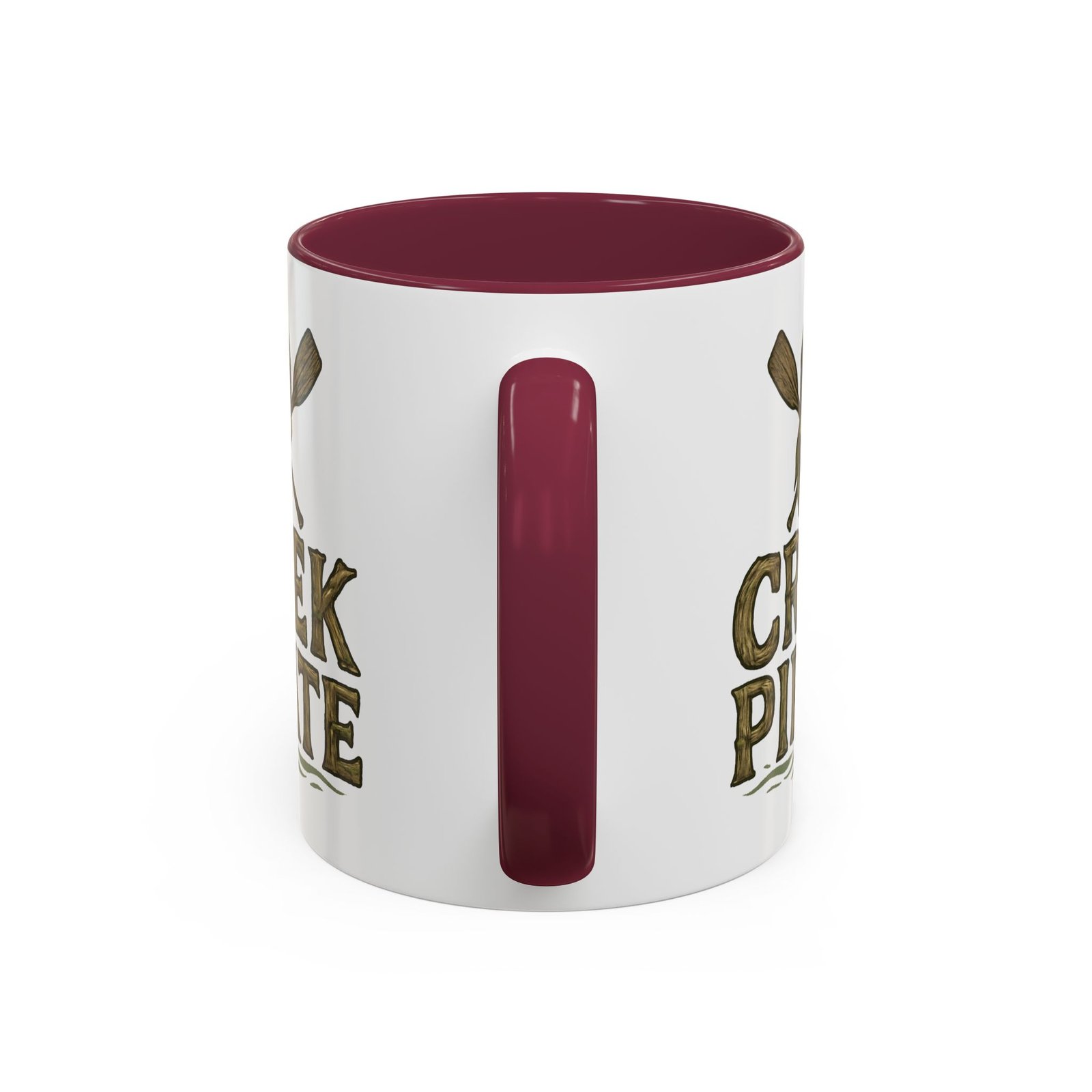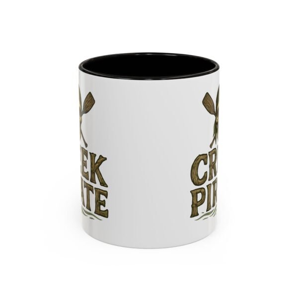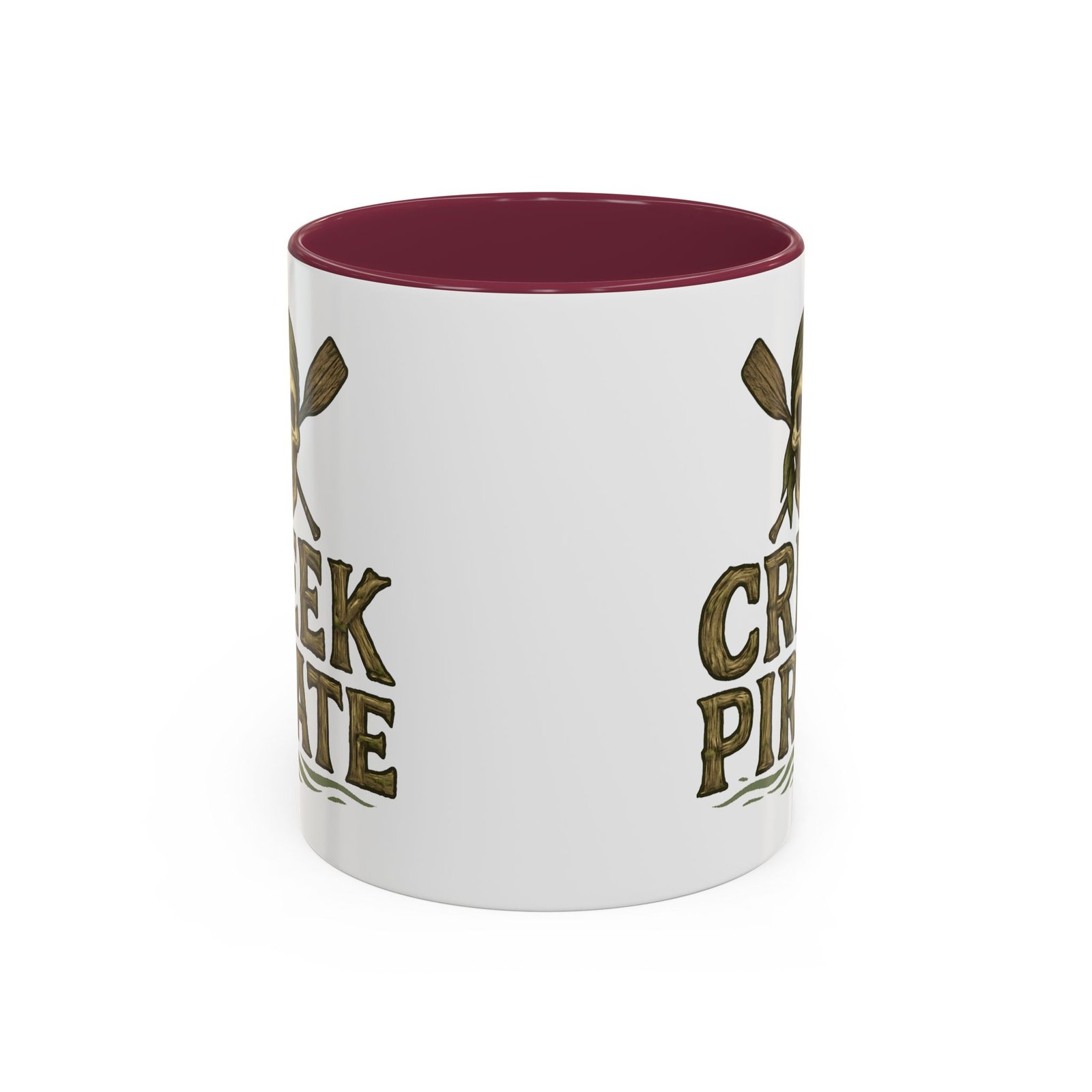 DESIGN: Our Creek Pirate logo on a white background. Just says “CREEK PIRATE” with our pirate skull wearing a bandana and crossed oars. Colors include browns, greens, and black on a white background. Cup handle and inside of cup are black.