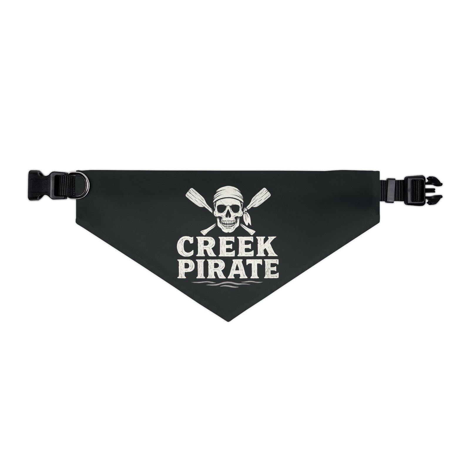 DESIGN: Our awesome Creek Pirate logo featuring a skull wearing a bandana with two crossed oars behind him. The text, CREEK PIRATE in whites and grays on a black background. We hope you and your dog love it!