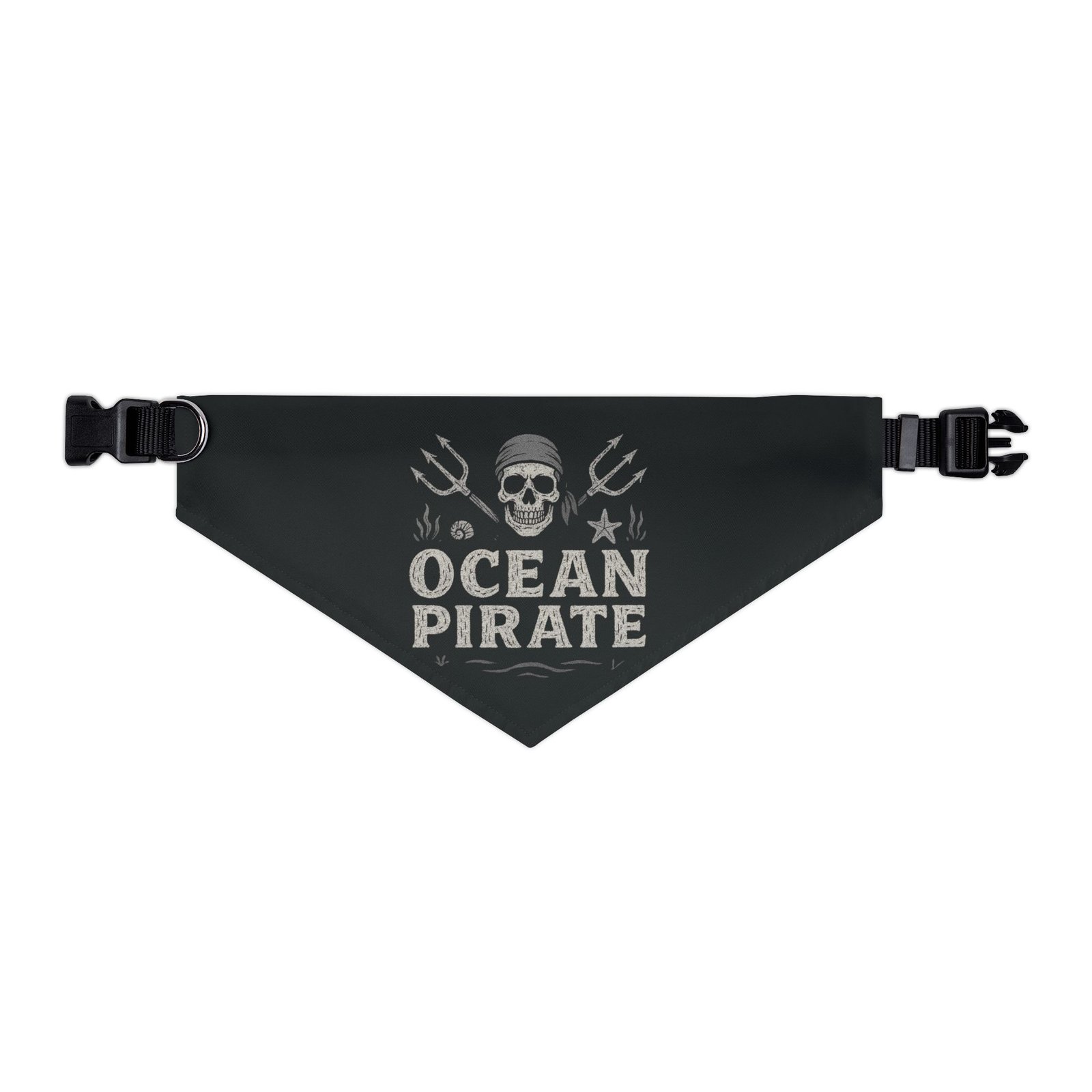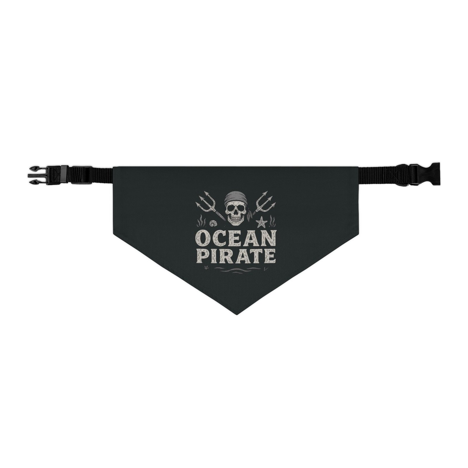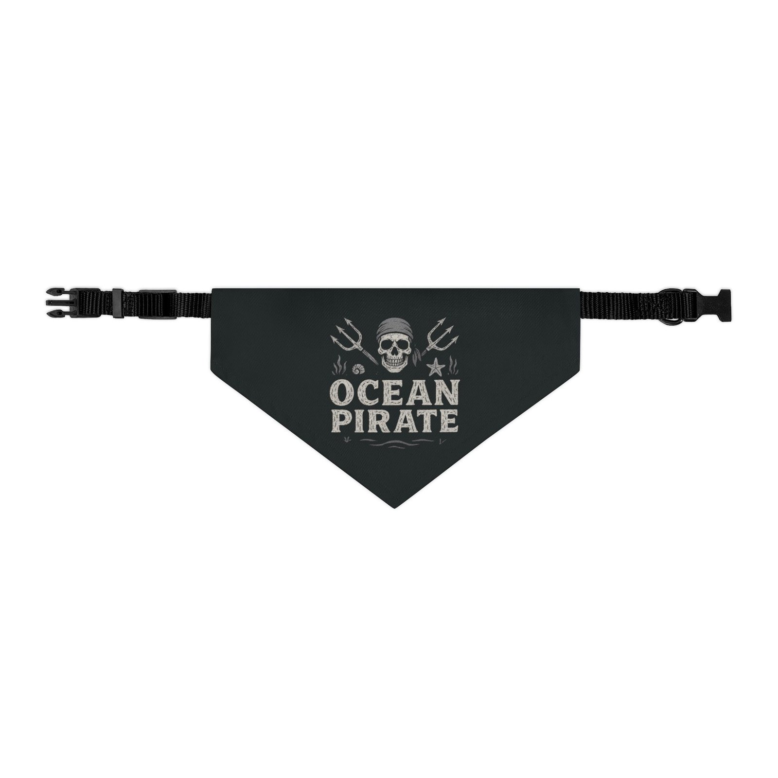 DESIGN: Our awesome Ocean Pirate logo featuring a skull wearing a bandana with two Neptune Spears. The text, OCEAN PIRATE in whites and grays on a black background. We hope you and your dog love it!