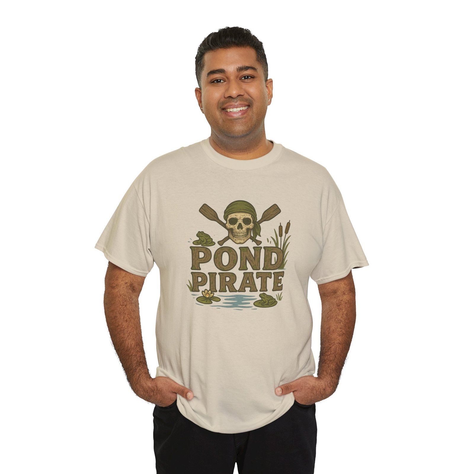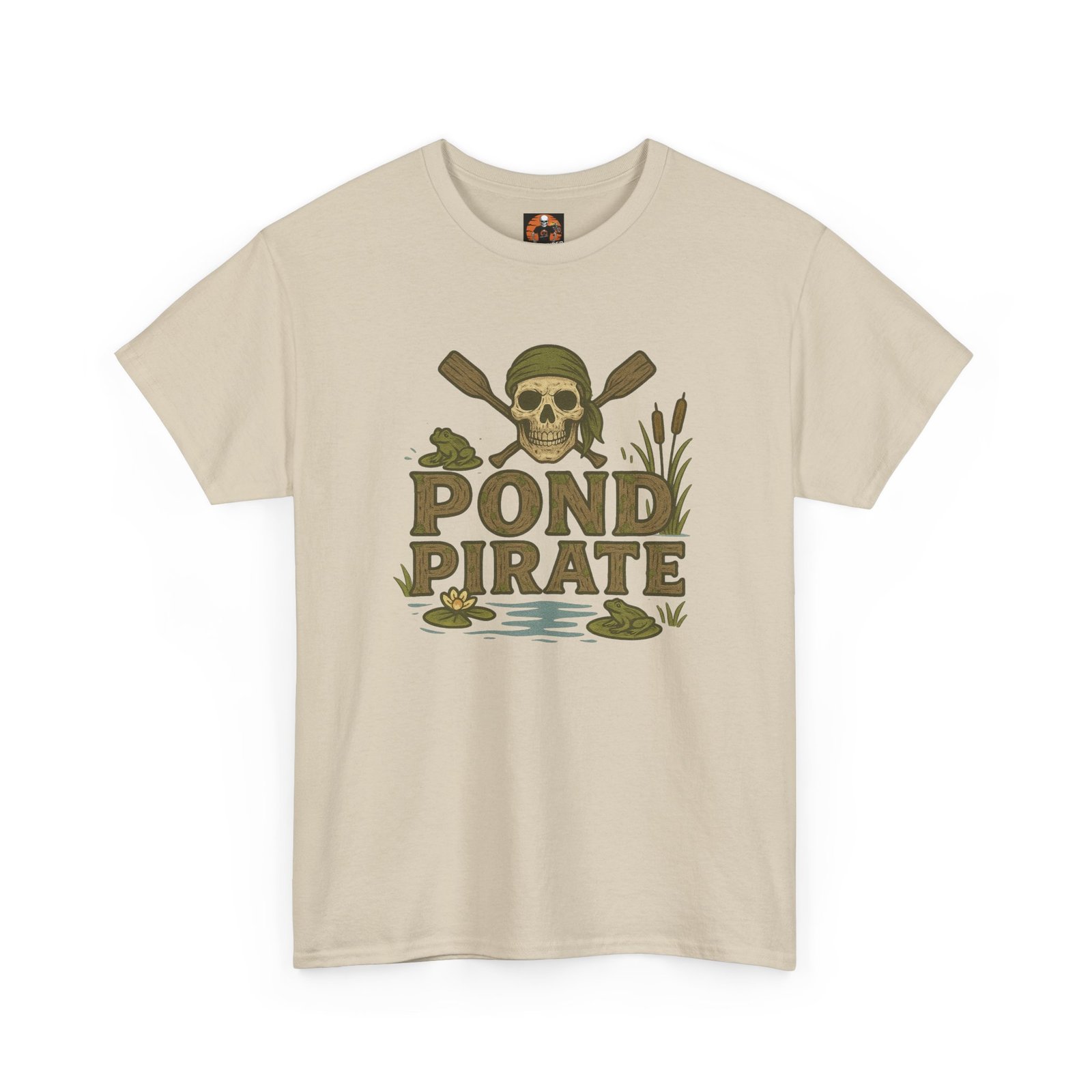 DESIGN: A classic fit tee featuring a skull wearing a bandana with crossed oars behind him and frogs and lily pads. The text, “POND PIRATE” in in browns and greens, to look like worn driftwood. Super cool creek style. The design is on the front. Colors include browns, greens, and black on your choice of tee color. Just plain fun for anyone who loves this creek lifestyle. Ideal for casual wear, canoeing or boating, 4th of July get togethers, summer bbqs, Father’s Day, Mother’s Day, and birthdays. We hope you love it!