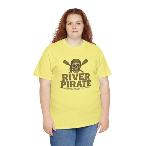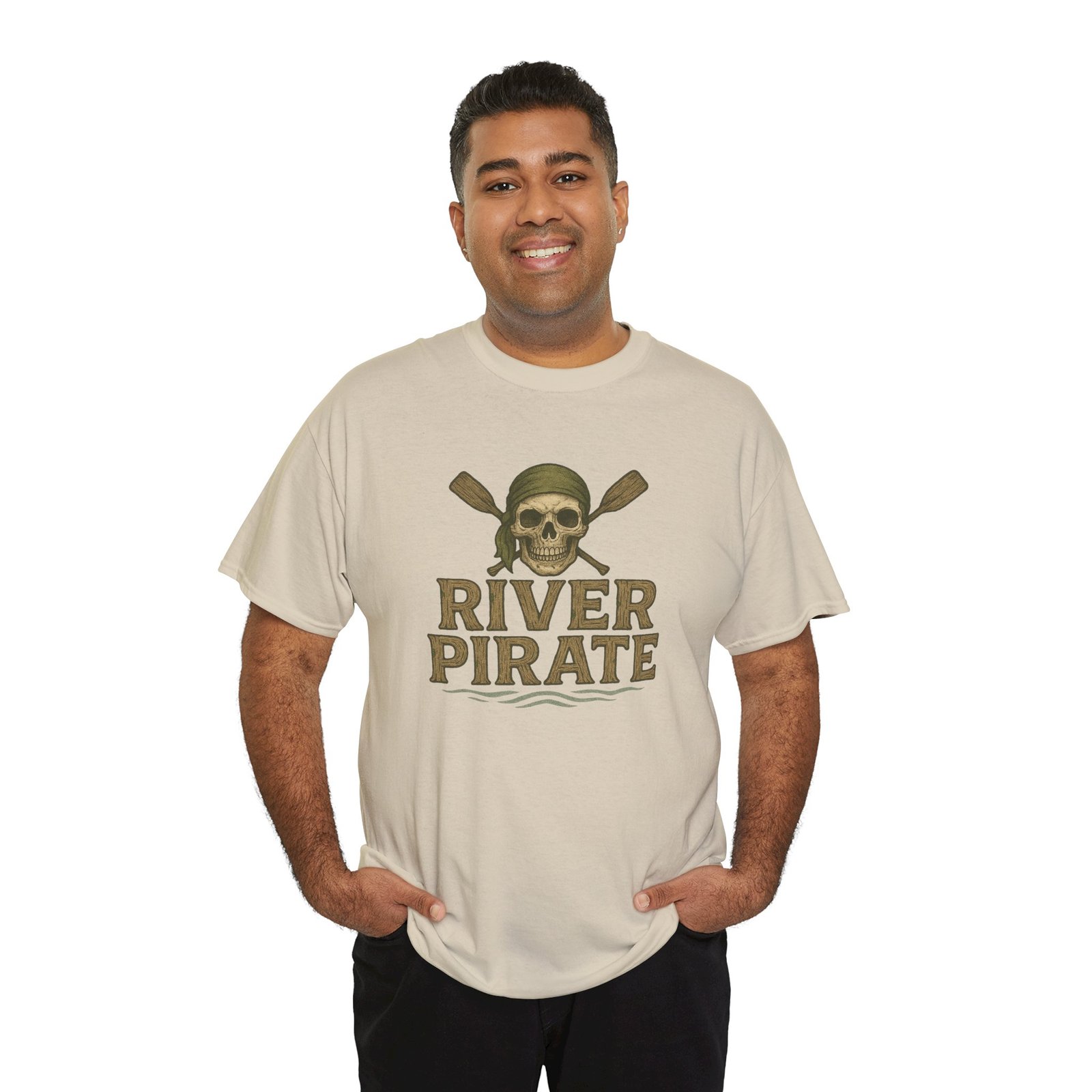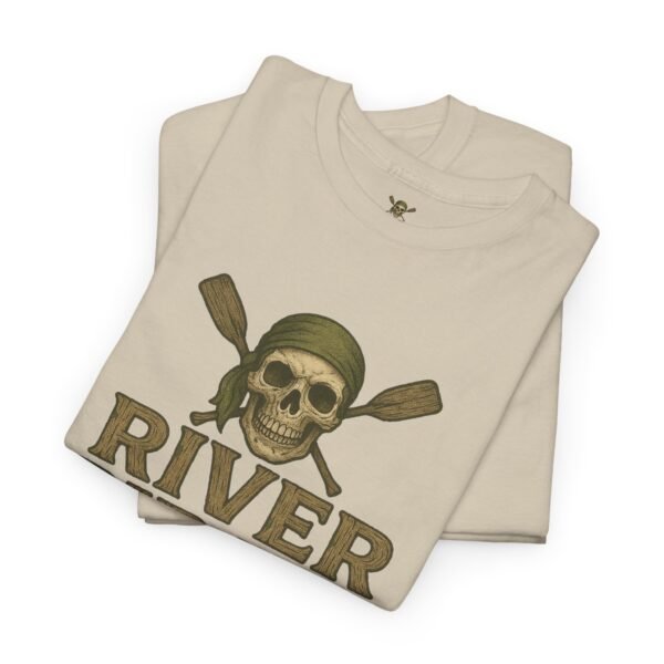 DESIGN: A classic fit tee featuring a skull wearing a bandana with crossed oars behind him and waves. The text, “RIVER PIRATE” in in browns and greens, to look like worn driftwood. Super cool creek style. The design is on the front. In your choice of tee color. Just plain fun for anyone who loves this river lifestyle. Ideal for casual wear, canoeing or boating, 4th of July get togethers, summer bbqs, Father’s Day, Mother’s Day, and birthdays. We hope you love it!